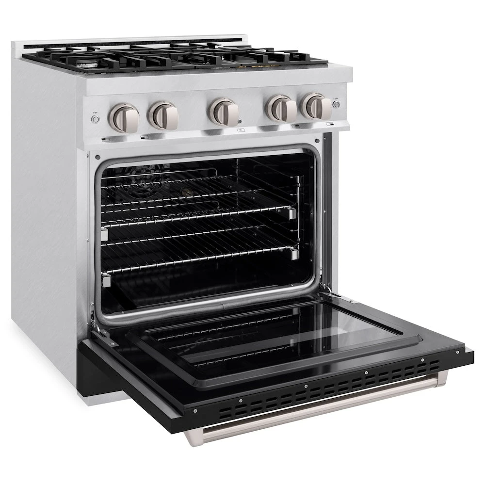 Luxury isn’t meant to be left desired—it’s meant to be attainable. The ZLINE 30 in. 4.2 cu. ft. Classic Dual Fuel Range with 4 Burner Gas Cooktop and Electric Convection Oven in Satin Stainless Steel with Black Matte Door (CDRS-BLM-30) combines the elegance of a hand-finished porcelain gas cooktop with 4 Italian-made auto-reignition burners, an electric convection oven with an energy-efficient cooling fan to ensure quiet operation, and a beautiful black matte door with a Landscape window design allowing you to master every meal. With a modern, timeless style and refined functionality, ZLINE Classic Dual Fuel Ranges are masterfully crafted to deliver an elevated culinary experience.