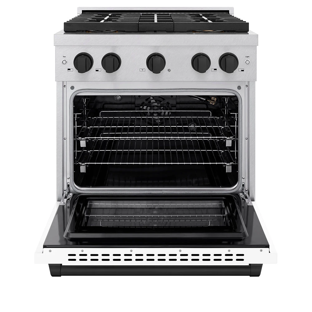 ZLINE Autograph Edition 30 In. 4.2 Cu. Ft. Paramount Gas Range With 4 Burner DuoPro™ Cooktop And Convection Gas Oven In Satin Stainless Steel With White Matte Door And Matte Black Accents (PSGRSZ-WM-30-MB)(Zline Autograph Edition 30 Paramount Gas Range Duopro Satin Stainless Steel White Matte Matte Black Psgrsz Wm 30 Mb)