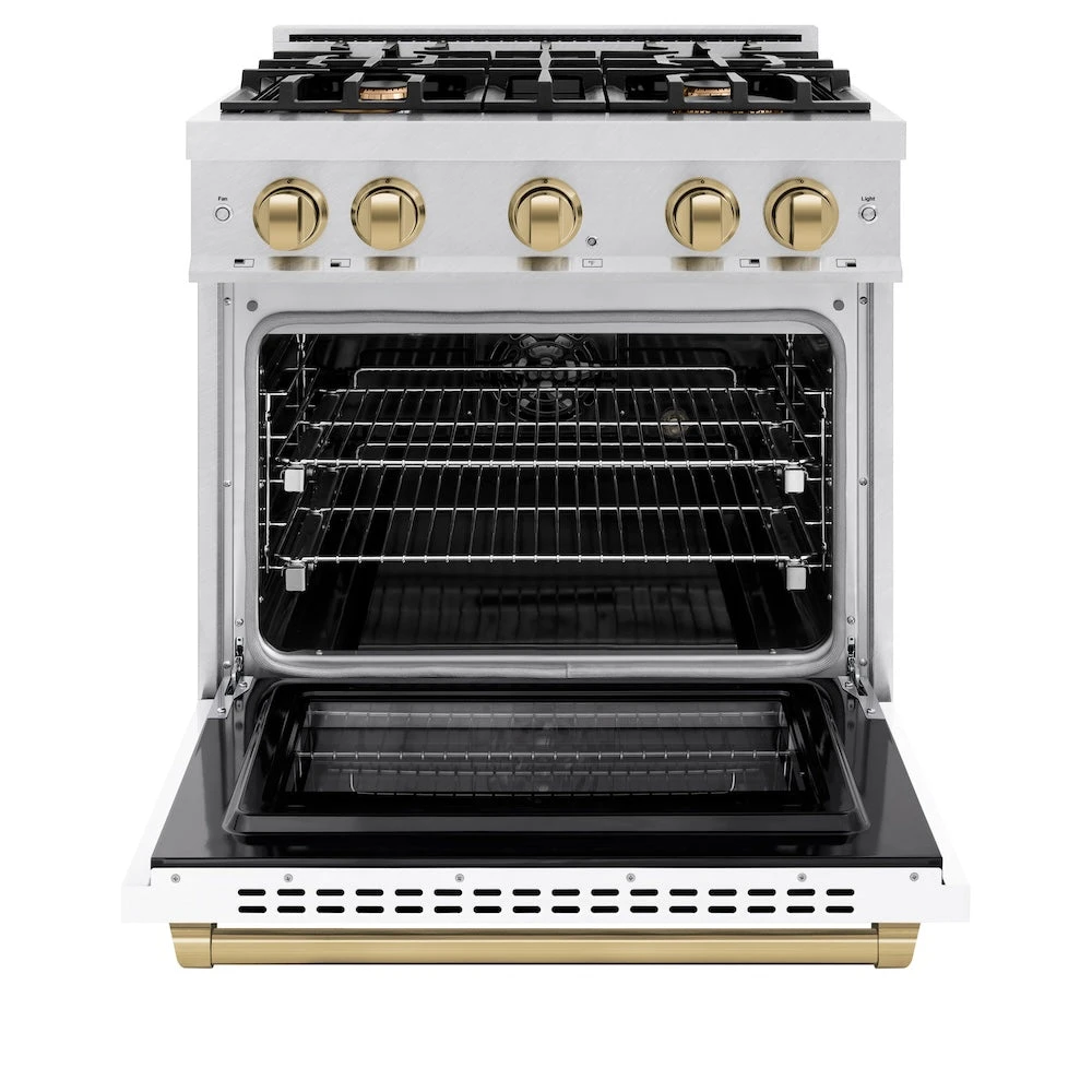 ZLINE Autograph Edition 30 In. 4.2 Cu. Ft. Select Dual Fuel Range With 4 Burner Gas Cooktop And Electric Convection Oven In Satin Stainless Steel With White Matte Door And Champagne Bronze Accents (HDRSZ-WM-30-CB)(Zline Autograph Edition 30 Select Dual Fuel Range Satin Stainless Steel White Matte Champagne Bronze Hdrsz Wm 30 Cb)