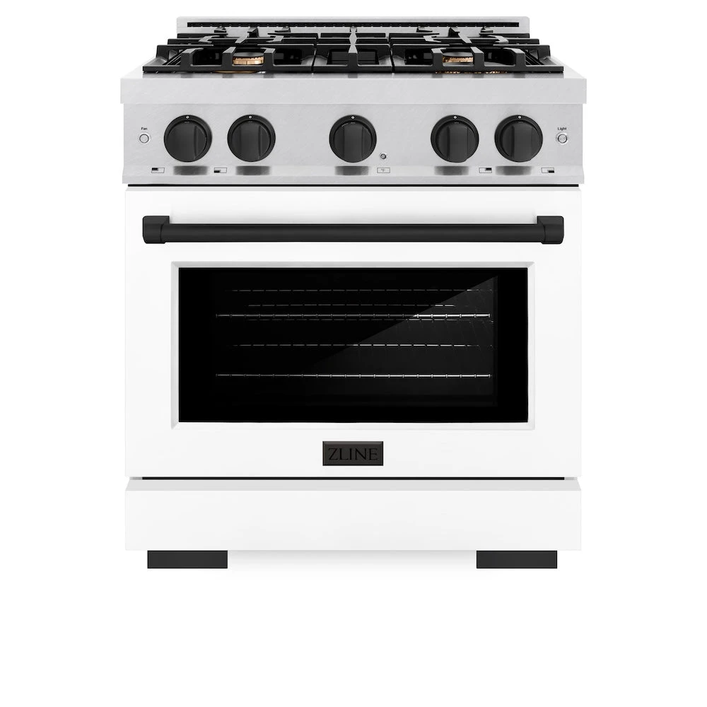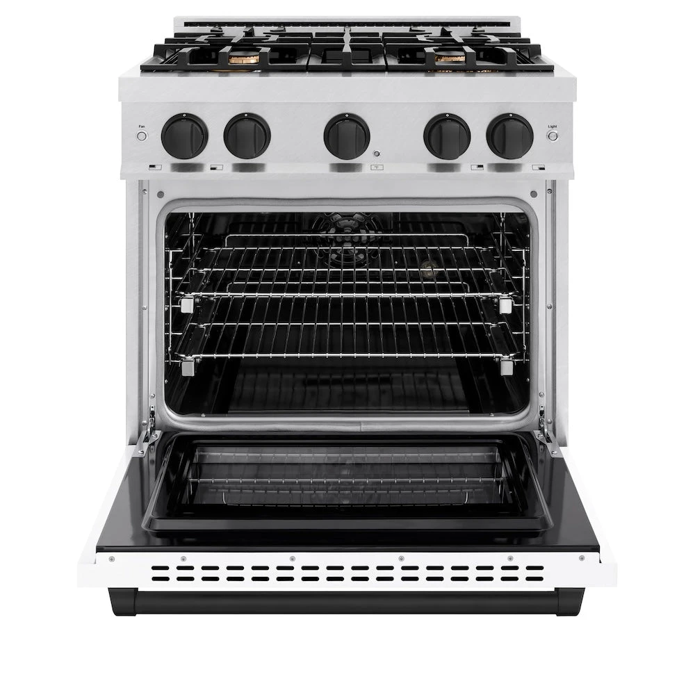 ZLINE Autograph Edition 30 In. 4.2 Cu. Ft. Select Dual Fuel Range With 4 Burner Gas Cooktop And Electric Convection Oven In Satin Stainless Steel With White Matte Door And Matte Black Accents (HDRSZ-WM-30-MB)(Zline Autograph Edition 30 Select Dual Fuel Range Satin Stainless Steel White Matte Matte Black Hdrsz Wm 30 Mb)