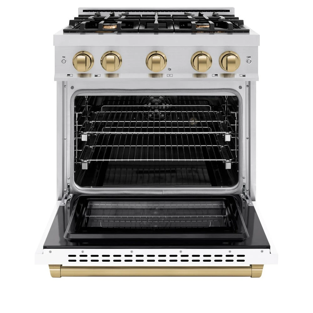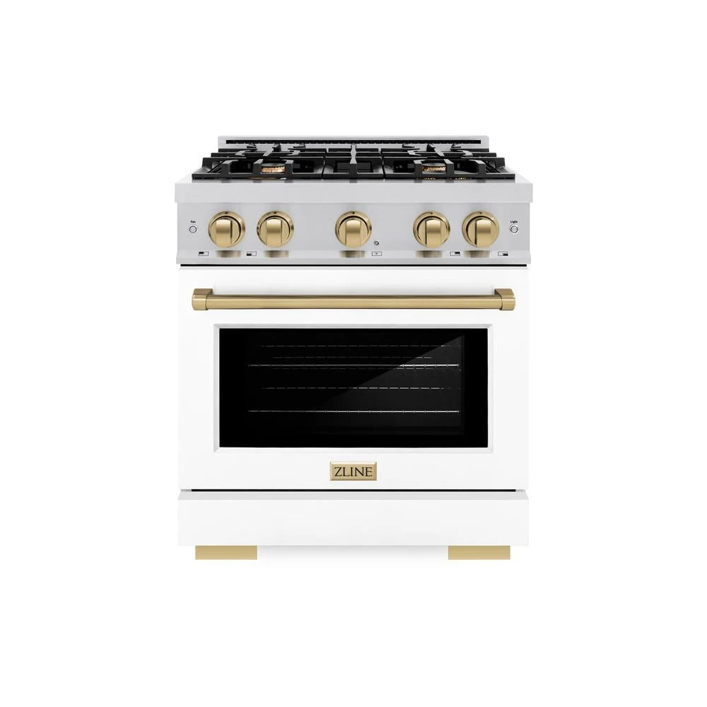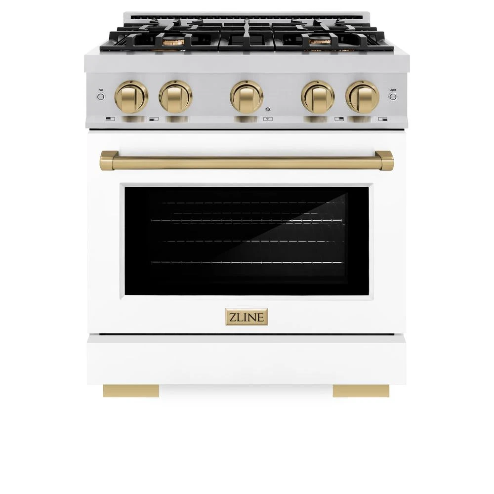 ZLINE Autograph Edition 30 In. 4.2 Cu. Ft. Select Dual Fuel Range With 4 Burner Gas Cooktop And Electric Convection Oven In Stainless Steel With White Matte Door And Champagne Bronze Accents (HDRZ-WM-30-CB)(Zline Autograph Edition 30 Select Dual Fuel Range Stainless Steel White Matte Champagne Bronze Hdrz Wm 30 Cb)
