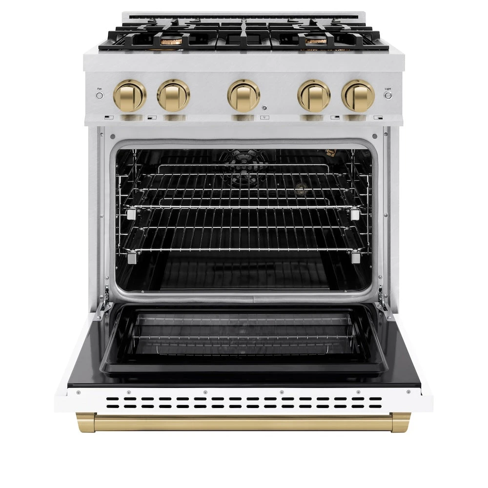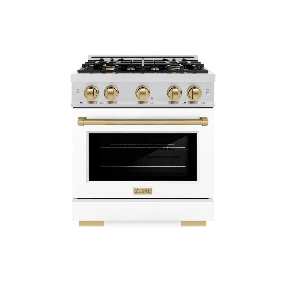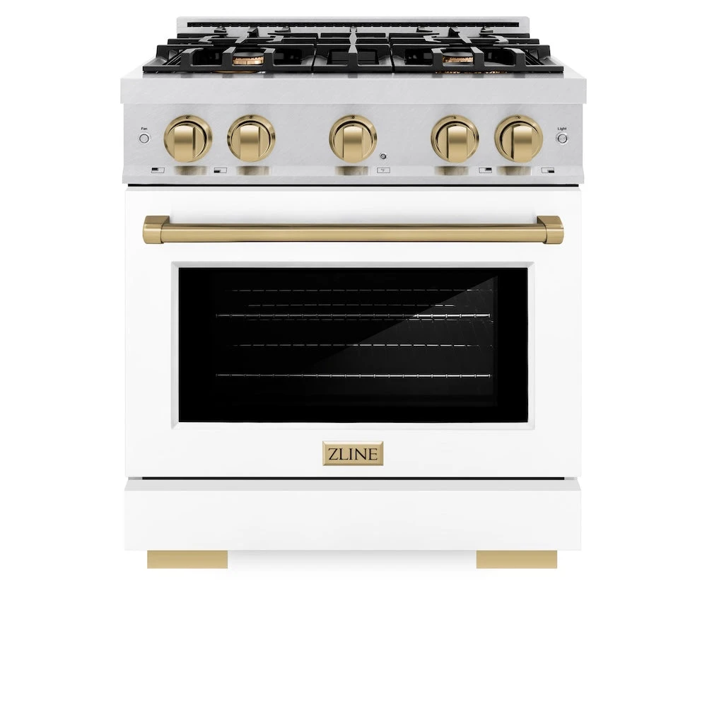 ZLINE Autograph Edition 30 In. 4.2 Cu. Ft. Select Gas Range With 4 Burner Cooktop And Convection Gas Oven In Satin Stainless Steel With White Matte Door And Champagne Bronze Accents (HGRSZ-WM-30-CB)(Zline Autograph Edition 30 Select Gas Range Satin Stainless Steel White Matte Champagne Bronze Hgrsz Wm 30 Cb)