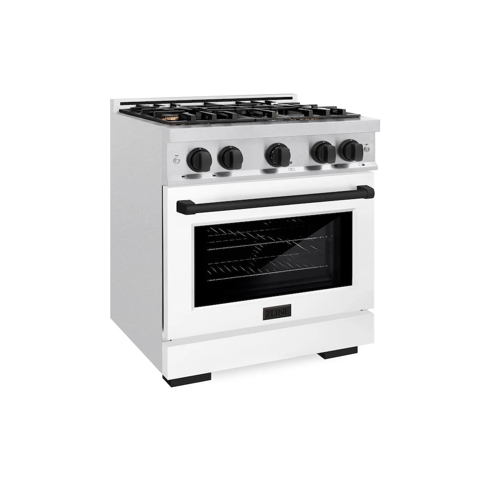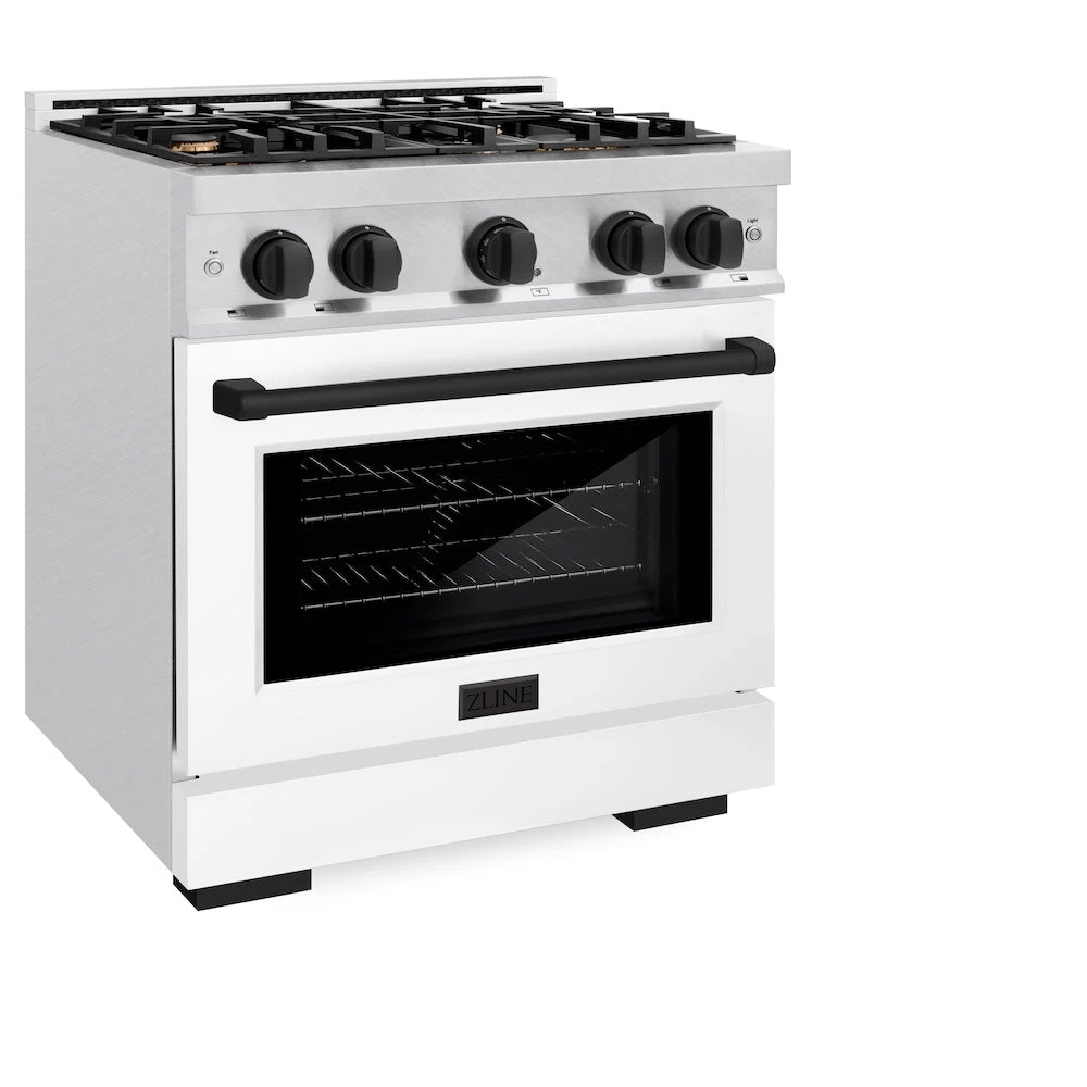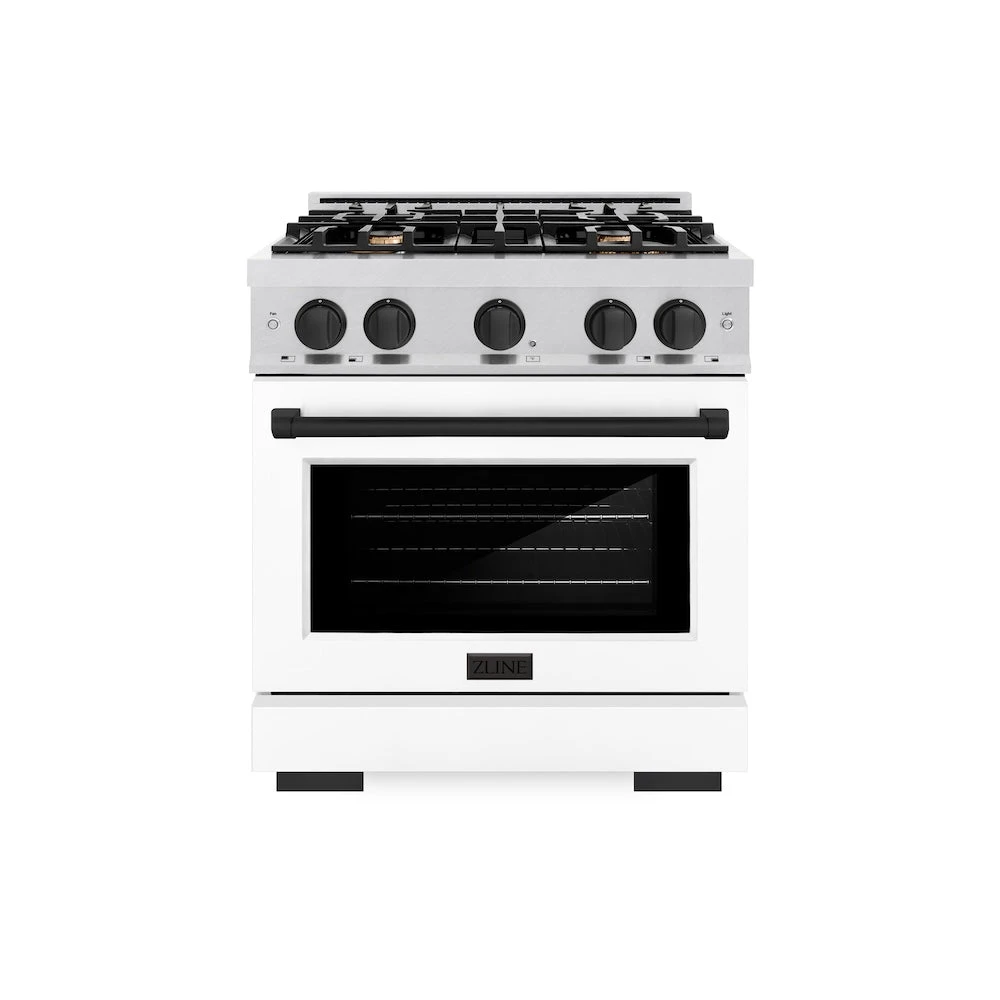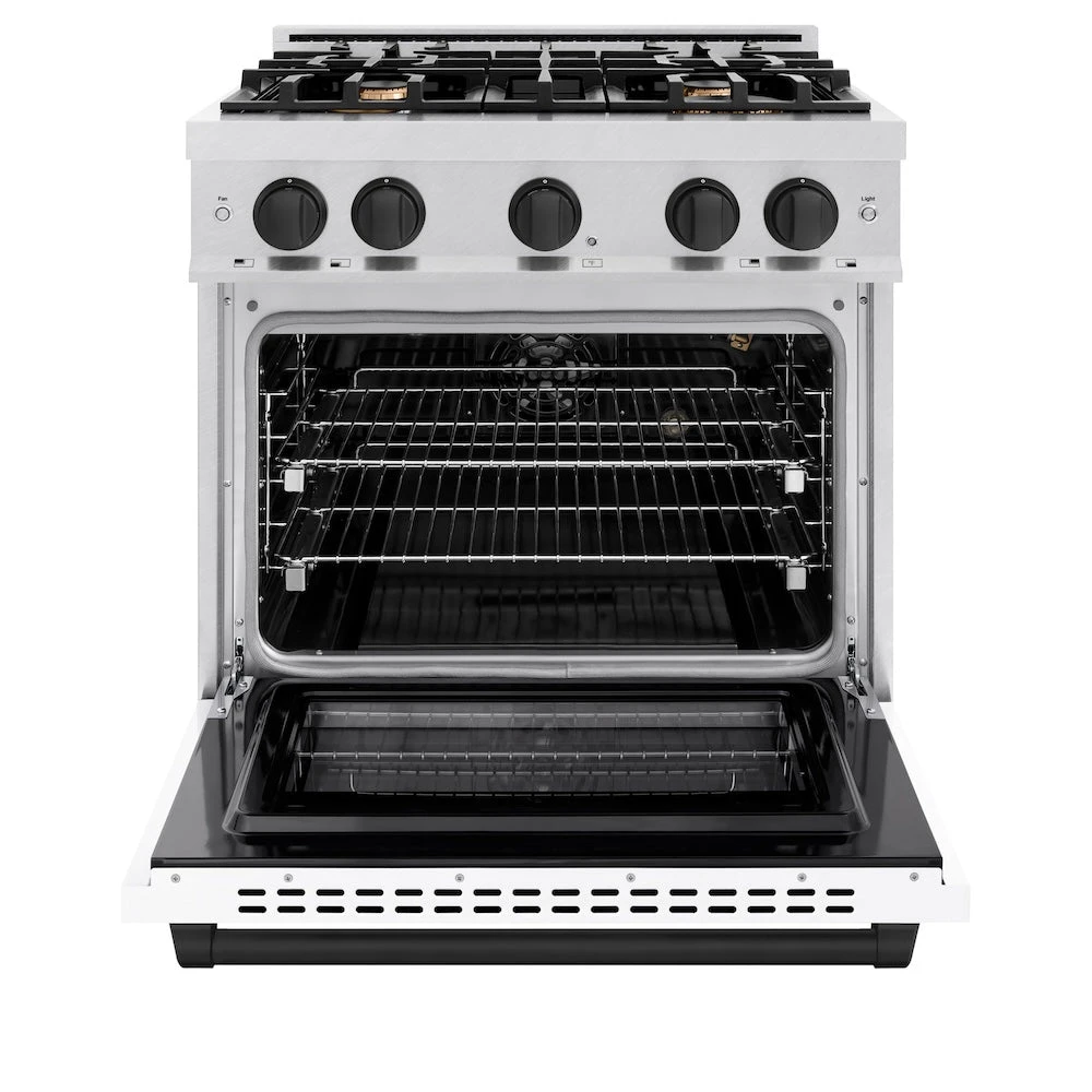 ZLINE Autograph Edition 30 In. 4.2 Cu. Ft. Select Gas Range With 4 Burner Cooktop And Convection Gas Oven In Satin Stainless Steel With White Matte Door And Matte Black Accents (HGRSZ-WM-30-MB)(Zline Autograph Edition 30 Select Gas Range Satin Stainless Steel White Matte Matte Black Hgrsz Wm 30 Mb)
