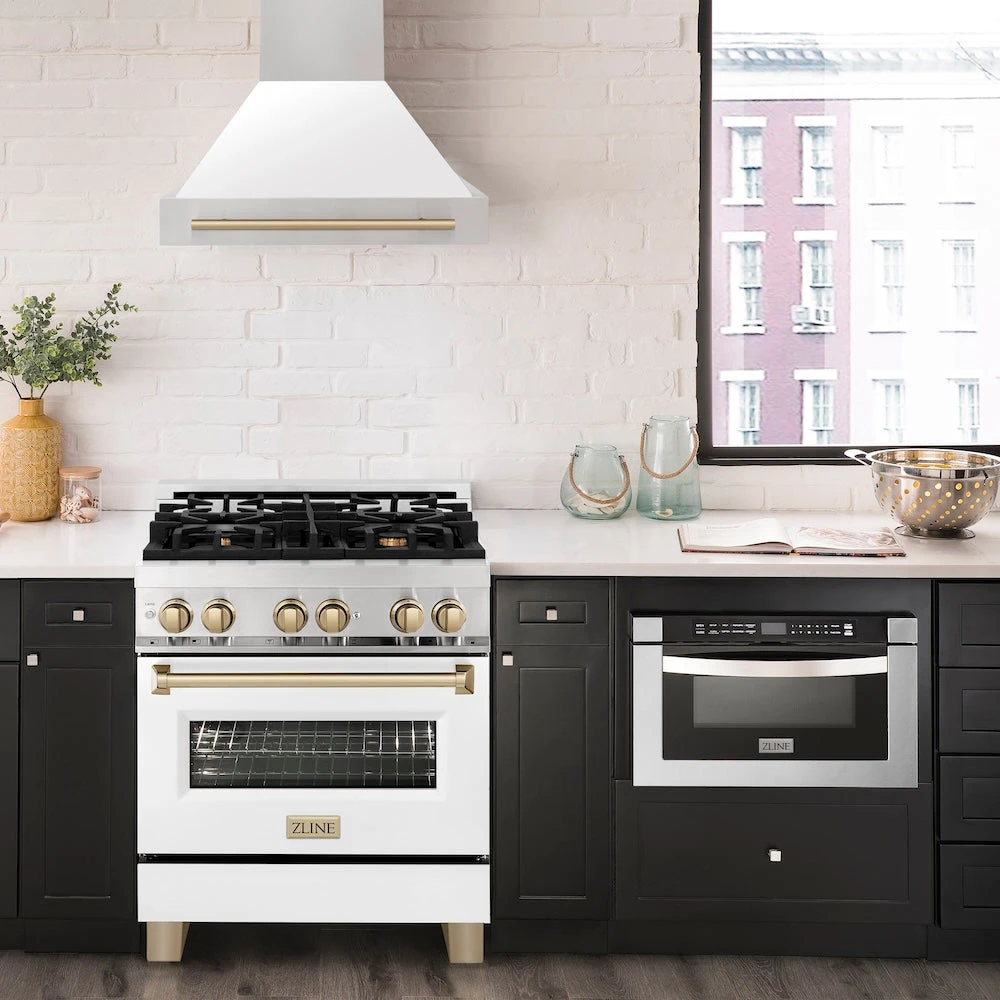 ZLINE Autograph Edition 30 In. Stainless Steel Range Hood With White Matte Shell And Champagne Bronze Handle (8654STZ-WM30-CB)(Zline Autograph Edition 30 Wall Mount Range Hood Stainless Steel White Matte Champagne Bronze 8654stz Wm30 Cb)