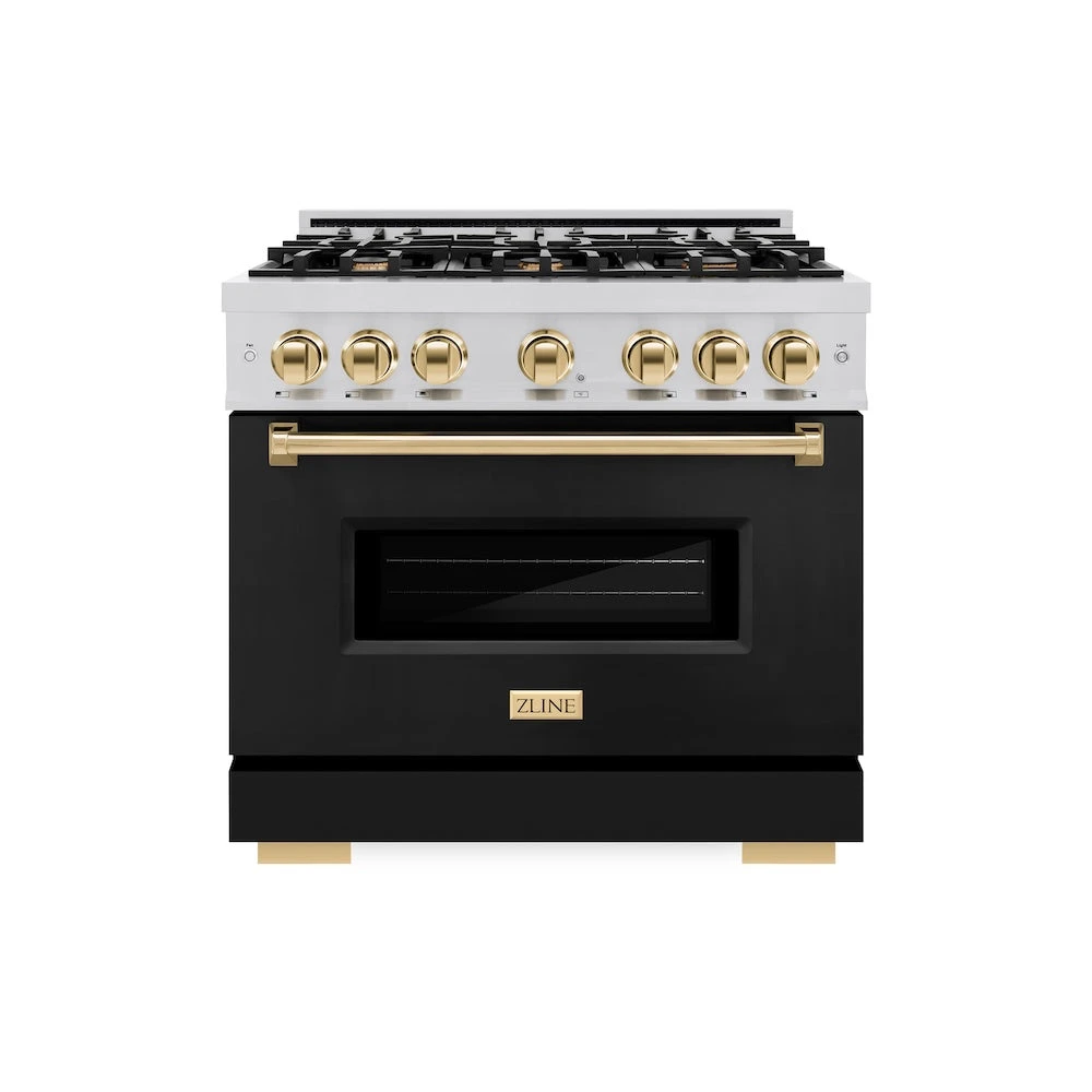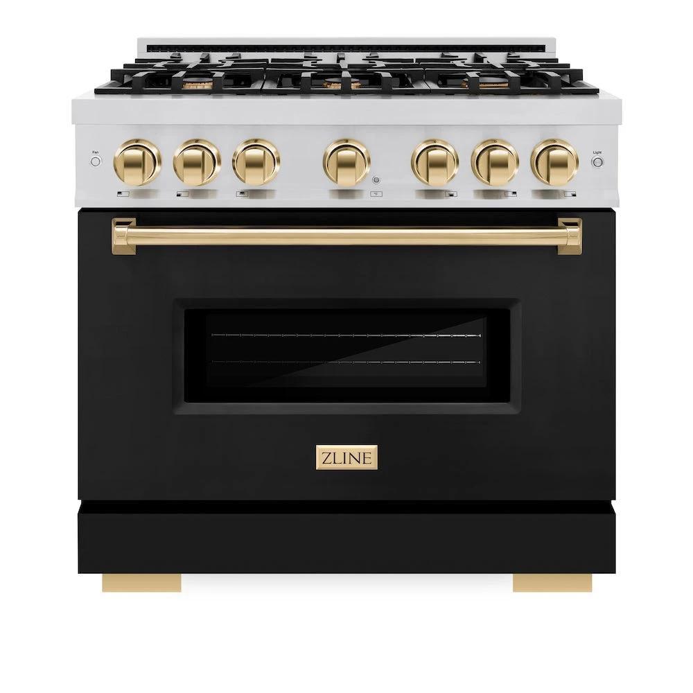 Luxury isn’t meant to be desired – it’s meant to be attainable. The ZLINE Autograph Edition 36 in. 5.2 cu. ft. Classic Dual Fuel Range with 6 Burner Gas Cooktop and Electric Convection Oven in Stainless Steel with Black Matte Door and Polished Gold Accents (CDRZ-BLM-36-G) combines the elegance of a hand-finished porcelain gas cooktop with 6 Italian-made auto-reignition burners, an electric convection oven with an energy-efficient cooling fan to ensure quiet operation, a beautiful black matte door with a Landscape window design, and stunning polished gold knobs and handle allowing you to master every meal. With a modern, timeless style and refined functionality, ZLINE Classic Dual Fuel Ranges are masterfully crafted to deliver an elevated culinary experience.