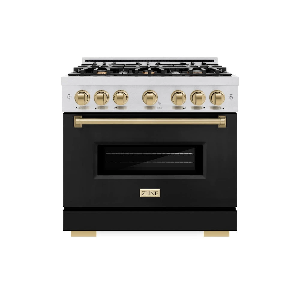 ZLINE Autograph Edition 36 In. 5.2 Cu. Ft. Classic Gas Range With 6 Burner Cooktop And Convection Gas Oven In Satin Stainless Steel With Black Matte Door And Champagne Bronze Accents (CGRSZ-BLM-36-CB)(Zline Autograph Edition 36 Classic Gas Range Satin Stainless Steel Black Matte Champagne Bronze Cgrsz Blm 36 Cb)