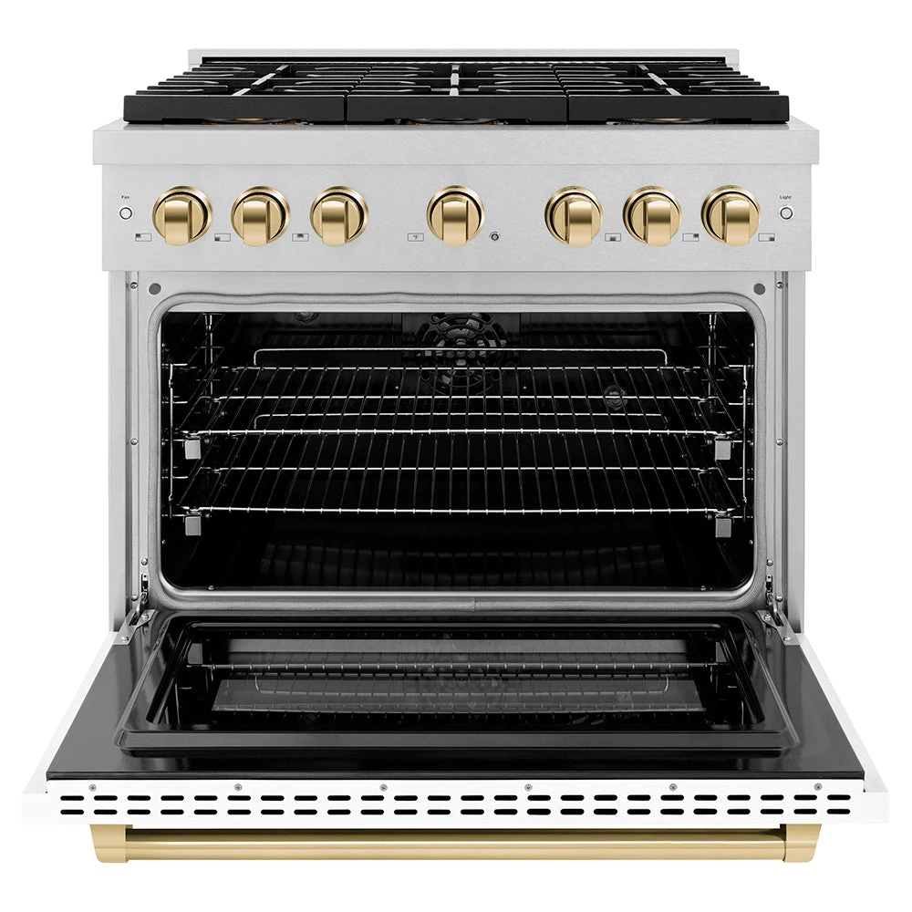 ZLINE Autograph Edition 36 In. 5.2 Cu. Ft. Paramount Dual Fuel Range With 6 Burner DuoPro™ Cooktop And Electric Convection Oven In Satin Stainless Steel With White Matte Door And Polished Gold Accents (PSDRSZ-WM-36-G)(Zline Autograph Edition 36 Paramount Dual Fuel Range Duopro Satin Stainless Steel White Matte Polished Gold Psdrsz Wm 36 G)