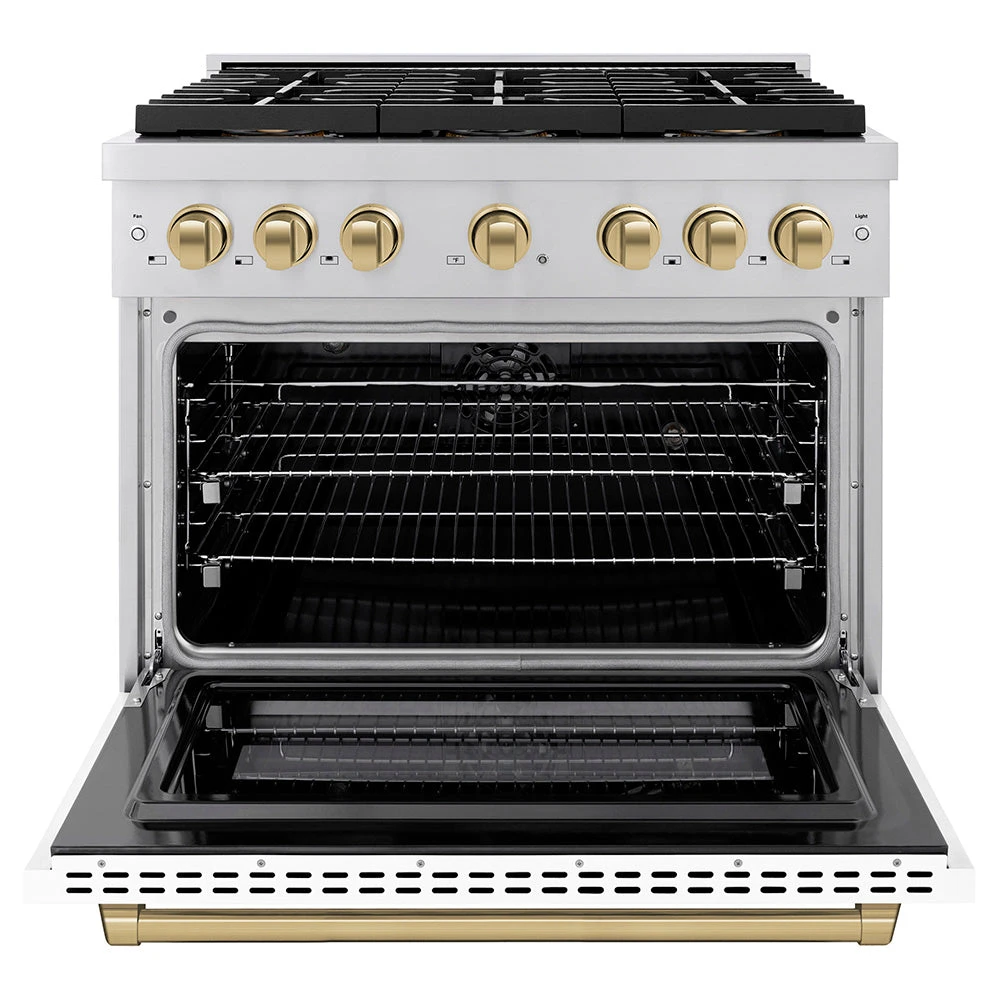 ZLINE Autograph Edition 36 In. 5.2 Cu. Ft. Paramount Dual Fuel Range With 6 Burner DuoPro™ Cooktop And Electric Convection Oven With White Matte Door And Champagne Bronze Accents (PSDRZ-WM-36-CB)(Zline Autograph Edition 36 Paramount Dual Fuel Range Duopro Stainless Steel White Matte Champagne Bronze Psdrz Wm 36 Cb)