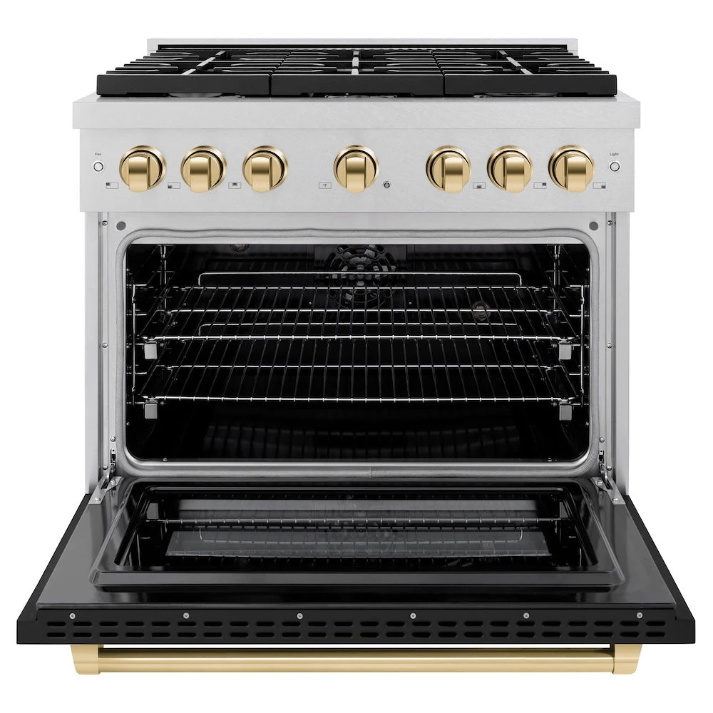 ZLINE Autograph Edition 36 In. 5.2 Cu. Ft. Paramount Dual Fuel Range With 6 Burner Gas Cooktop And Electric Convection Oven In Satin Stainless Steel With Black Matte Door And Polished Gold Accents (SDRSZ-BLM-36-G)(Zline Autograph Edition 36 Paramount Dual Fuel Range Satin Stainless Steel Black Matte Polished Gold Sdrsz Blm 36 G)