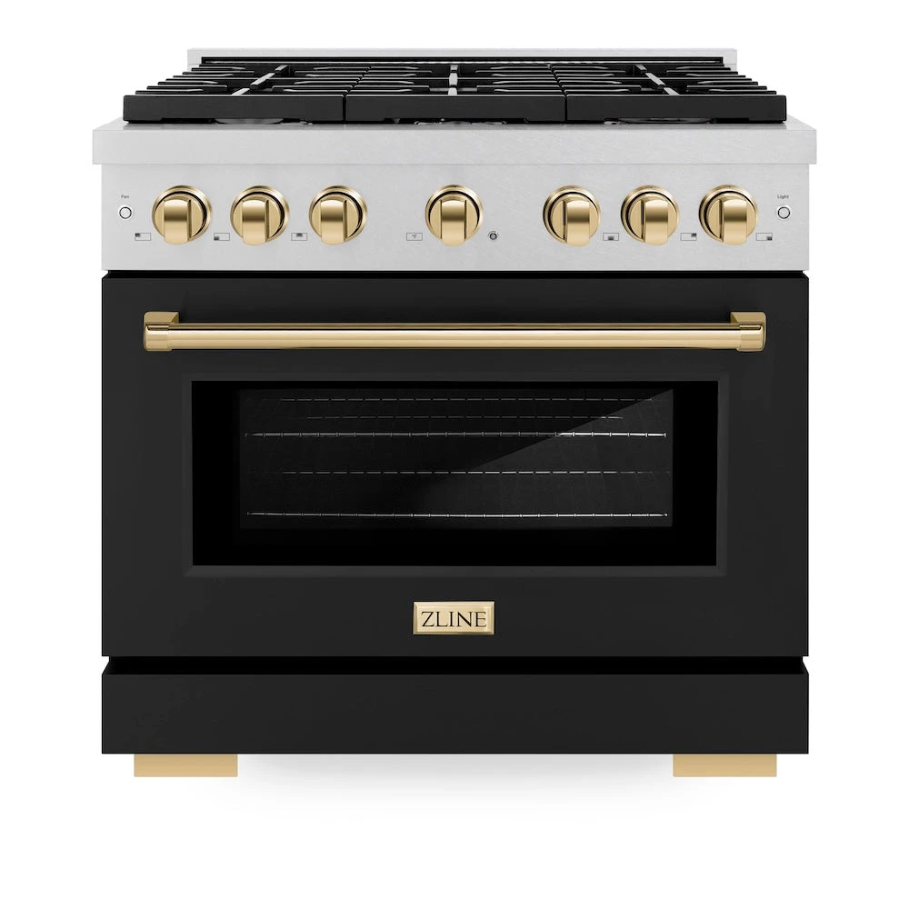 Luxury isn’t meant to be left desired—it’s meant to be attainable. The ZLINE Autograph Edition 36 in. 5.2 cu. ft. Paramount Dual Fuel Range with 6 Burner Gas Cooktop and Electric Convection Oven in Satin Stainless Steel with Black Matte Door and Polished Gold Accents (SDRSZ-BLM-36-G) combines the versatility of a gas cooktop with 6 Italian-made auto-reignition burners, an electric convection oven with digital thermostat technology, enhanced cast iron grates, a beautiful black matte door with a Horizon window design, and elegant polished gold knobs and handle allowing you to master every meal. With a modern, timeless style and refined functionality, ZLINE Paramount Dual Fuel Ranges are masterfully crafted to deliver an elevated culinary experience.