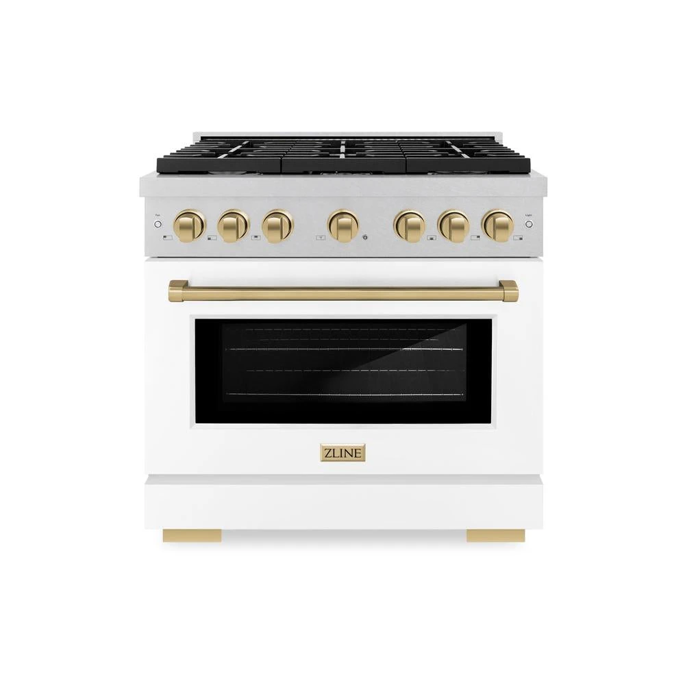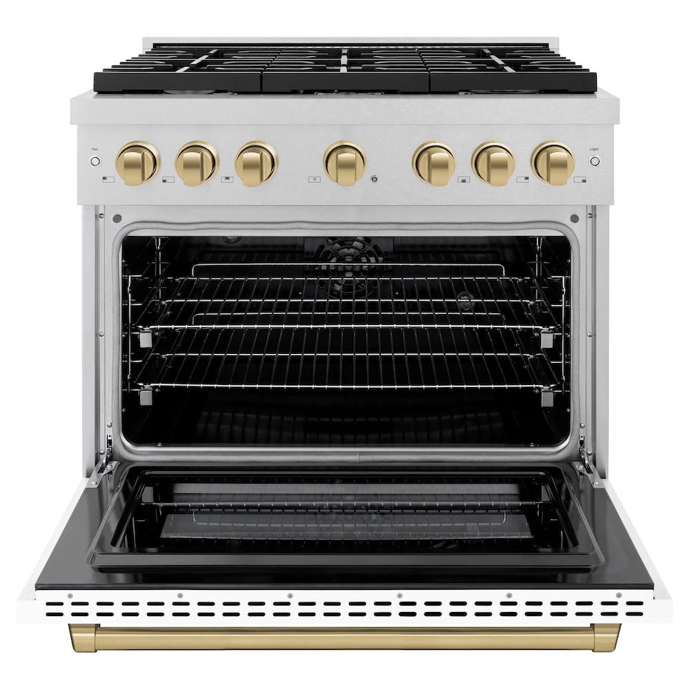 ZLINE Autograph Edition 36 In. 5.2 Cu. Ft. Paramount Dual Fuel Range With 6 Burner Gas Cooktop And Electric Convection Oven In Satin Stainless Steel With White Matte Door And Champagne Bronze Accents (SDRSZ-WM-36-CB)(Zline Autograph Edition 36 Paramount Dual Fuel Range Satin Stainless Steel White Matte Champagne Bronze Sdrsz Wm 36 Cb)