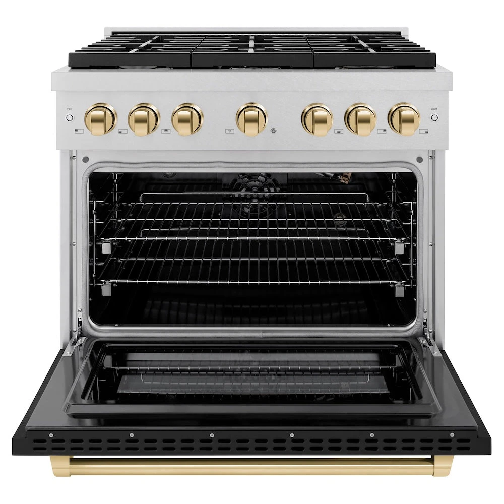 ZLINE Autograph Edition 36 In. 5.2 Cu. Ft. Paramount Gas Range With 6 Burner Cooktop And Convection Gas Oven In Satin Stainless Steel With Black Matte Door And Polished Gold Accents (SGRSZ-BLM-36-G)(Zline Autograph Edition 36 Paramount Gas Range Satin Stainless Steel Black Matte Polished Gold Sgrsz Blm 36 G)