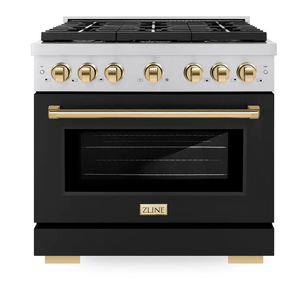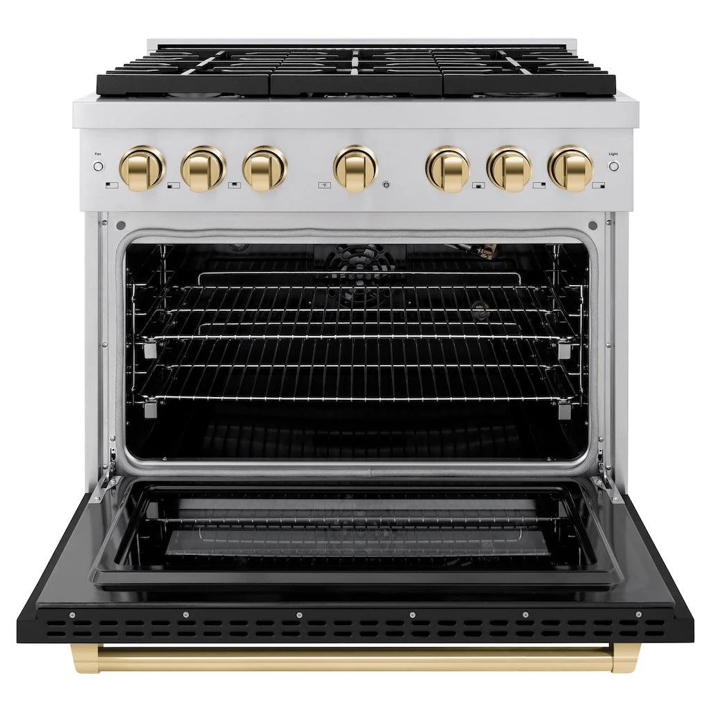 ZLINE Autograph Edition 36 In. 5.2 Cu. Ft. Paramount Gas Range With 6 Burner Cooktop And Convection Gas Oven In Stainless Steel With Black Matte Door And Polished Gold Accents (SGRZ-BLM-36-G)(Zline Autograph Edition 36 Paramount Gas Range Stainless Steel Black Matte Polished Gold Sgrz Blm 36 G)