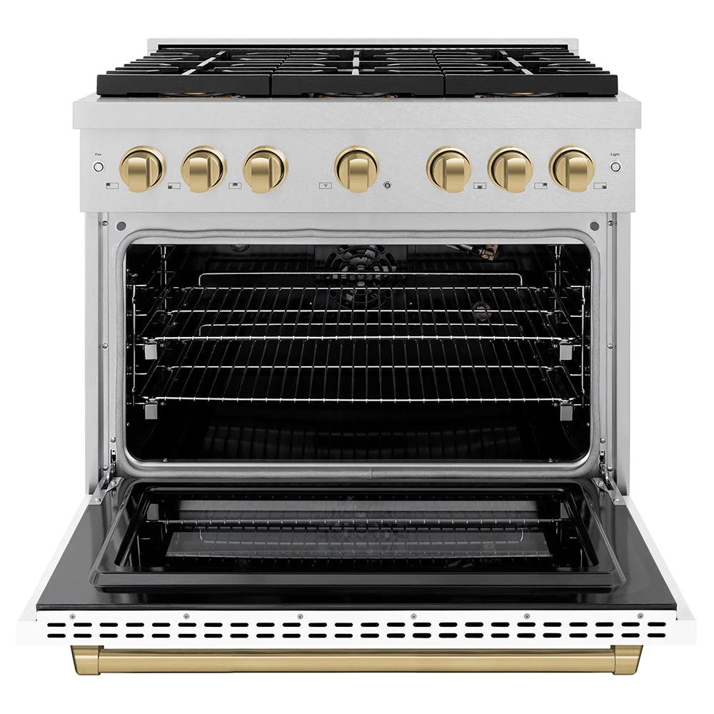 ZLINE Autograph Edition 36 In. 5.2 Cu. Ft. Paramount Gas Range With 6 Burner DuoPro™ Cooktop And Convection Gas Oven In Satin Stainless Steel With White Matte Door And Champagne Bronze Accents (PSGRSZ-WM-36-CB)(Zline Autograph Edition 36 Paramount Gas Range Duopro Satin Stainless Steel White Matte Champagne Bronze Psgrsz Wm 36 Cb)