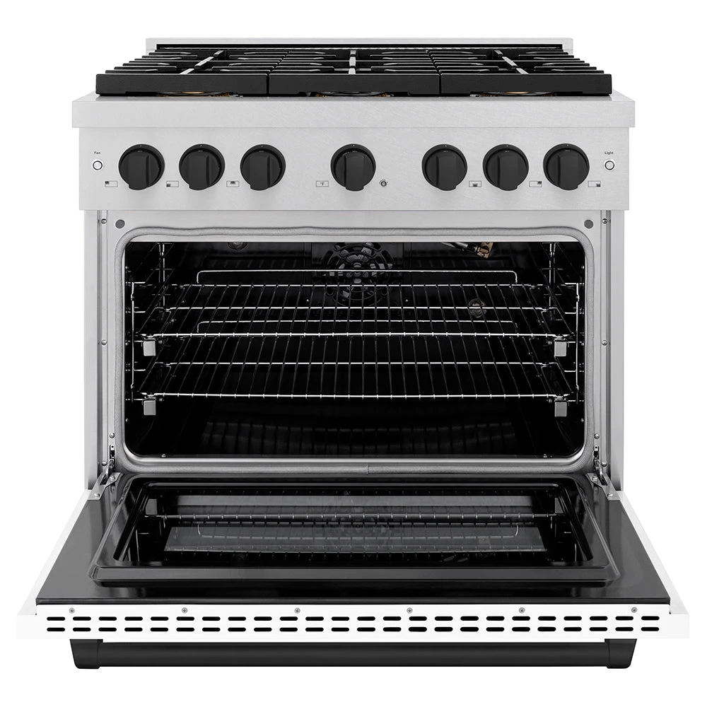 ZLINE Autograph Edition 36 In. 5.2 Cu. Ft. Paramount Gas Range With 6 Burner DuoPro™ Cooktop And Convection Gas Oven In Satin Stainless Steel With White Matte Door And Matte Black Accents (PSGRSZ-WM-36-MB)(Zline Autograph Edition 36 Paramount Gas Range Duopro Satin Stainless Steel White Matte Matte Black Psgrsz Wm 36 Mb)