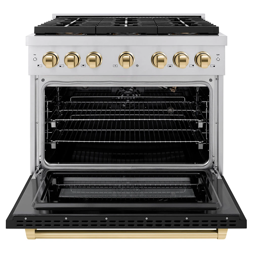 ZLINE Autograph Edition 36 In. 5.2 Cu. Ft. Paramount Gas Range With 6 Burner DuoPro™ Cooktop And Convection Gas Oven With Black Matte Door And Polished Gold Accents (PSGRZ-BLM-36-G)(Zline Autograph Edition 36 Paramount Gas Range Duopro Stainless Steel Black Matte Polished Gold Psgrz Blm 36 G)
