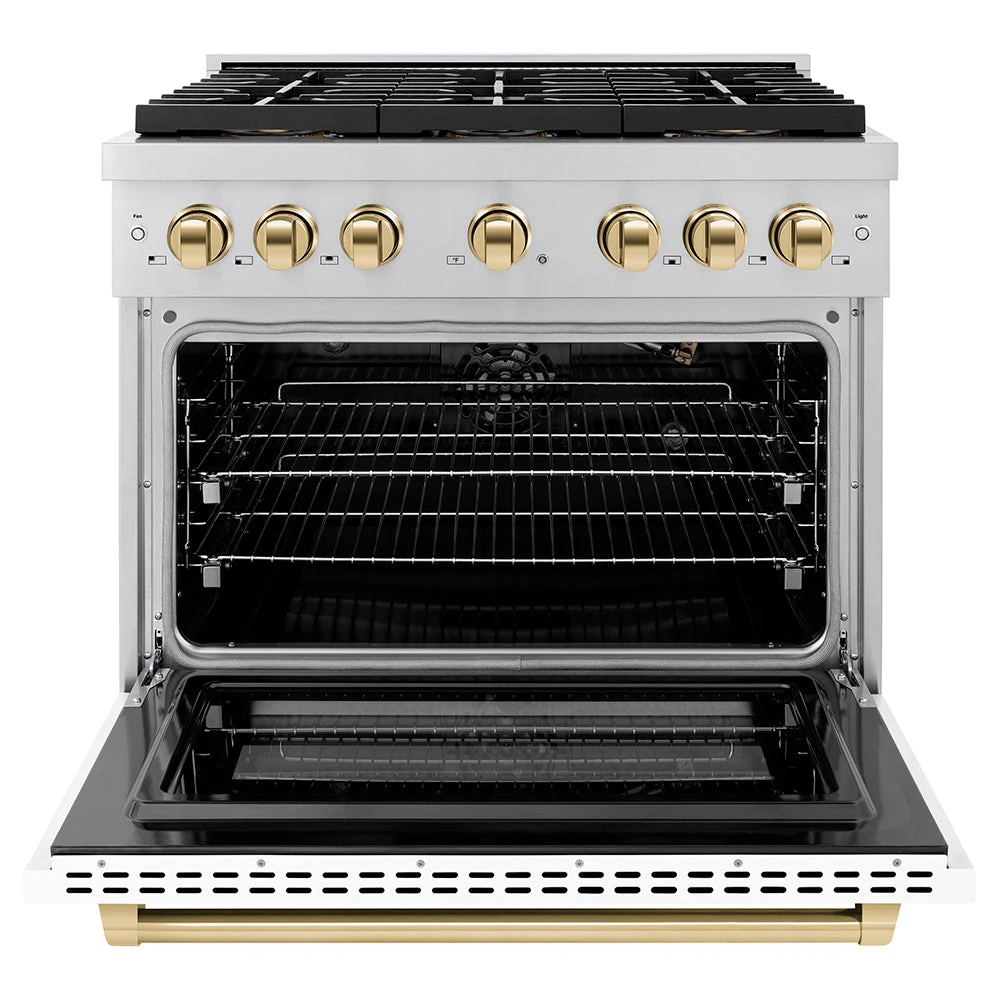 ZLINE Autograph Edition 36 In. 5.2 Cu. Ft. Paramount Gas Range With 6 Burner DuoPro™ Cooktop And Convection Gas Oven With White Matte Door And Polished Gold Accents (PSGRZ-WM-36-G)(Zline Autograph Edition 36 Paramount Gas Range Duopro Stainless Steel White Matte Polished Gold Psgrz Wm 36 G)