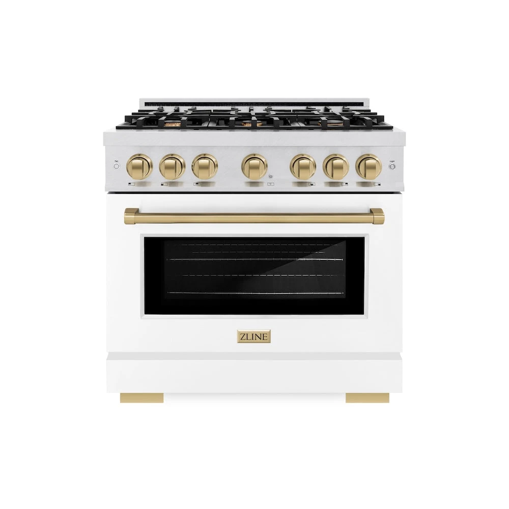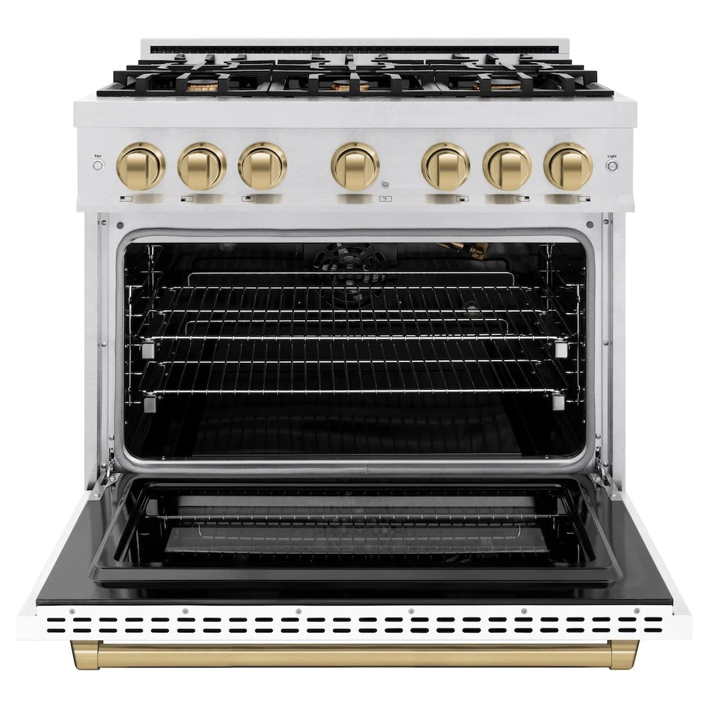 ZLINE Autograph Edition 36 In. 5.2 Cu. Ft. Select Gas Range With 6 Burner Cooktop And Convection Gas Oven In Satin Stainless Steel With White Matte Door And Champagne Bronze Accents (HGRSZ-WM-36-CB)(Zline Autograph Edition 36 Select Gas Range Satin Stainless Steel White Matte Champagne Bronze Hgrsz Wm 36 Cb)
