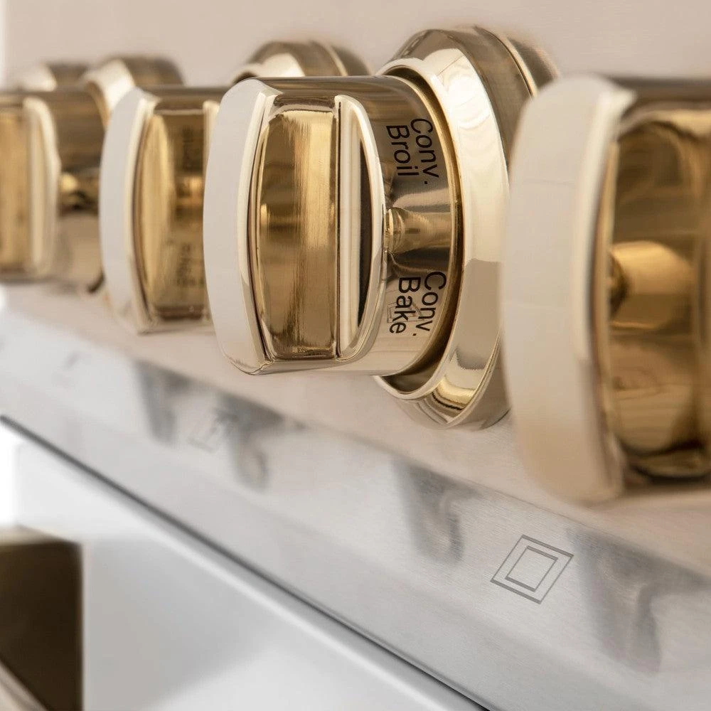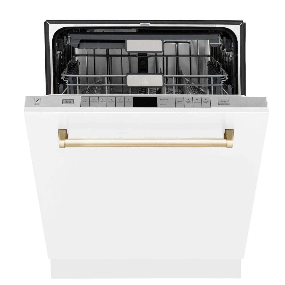 ZLINE Autograph Edition 36 In. Kitchen Package With Stainless Steel Dual Fuel Range With White Matte Door, Range Hood And Dishwasher With Polished Gold Accents (3AKP-RAWMRHDWM36-G)(Zline Autograph Edition 36 Kitchen Package Stainless Steel White Matte Gold 3akp Rawmrhdwm36 G)