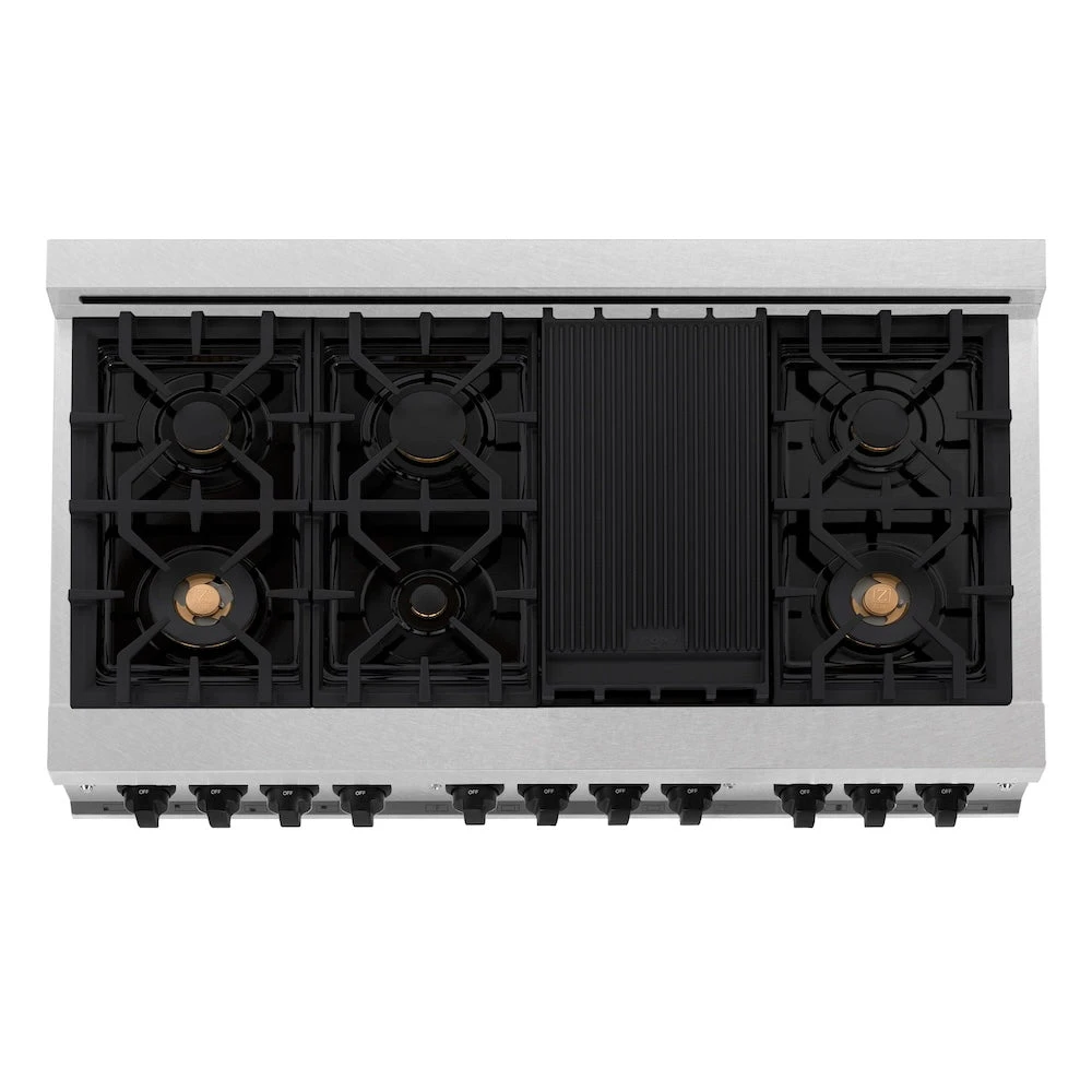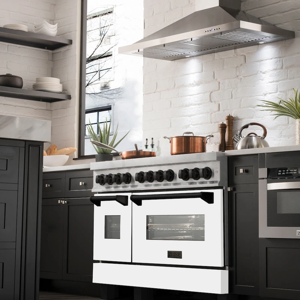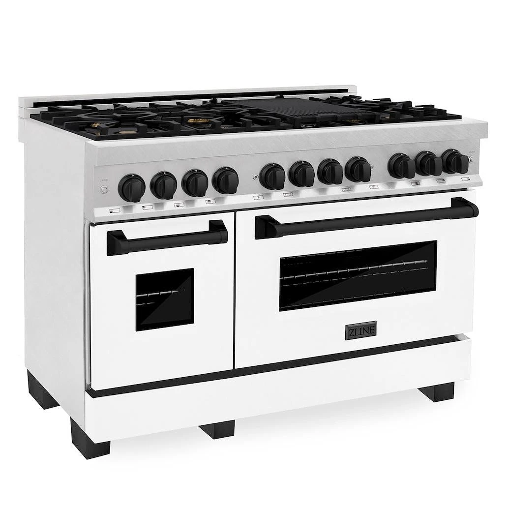 Luxury isn’t meant to be left desired—it’s meant to be attainable. The ZLINE Autograph Edition 48 in. 6.0 cu. ft. Legacy Dual Fuel Range with 7 Burner Gas Cooktop and 2 Electric Ovens in Satin Stainless Steel with White Matte Doors and Matte Black Accents (RASZ-WM-48-MB) pairs a powerful gas cooktop with 7 Italian-crafted burners, a large electric convection oven, a small bake and broil oven, beautiful white matte doors with Landscape window designs, and elegant matte black knobs and handles. With innovative features designed to enhance your kitchen’s capability, ZLINE Legacy Dual Fuel Ranges provide a professional culinary experience by pairing unmatched performance with timeless style.