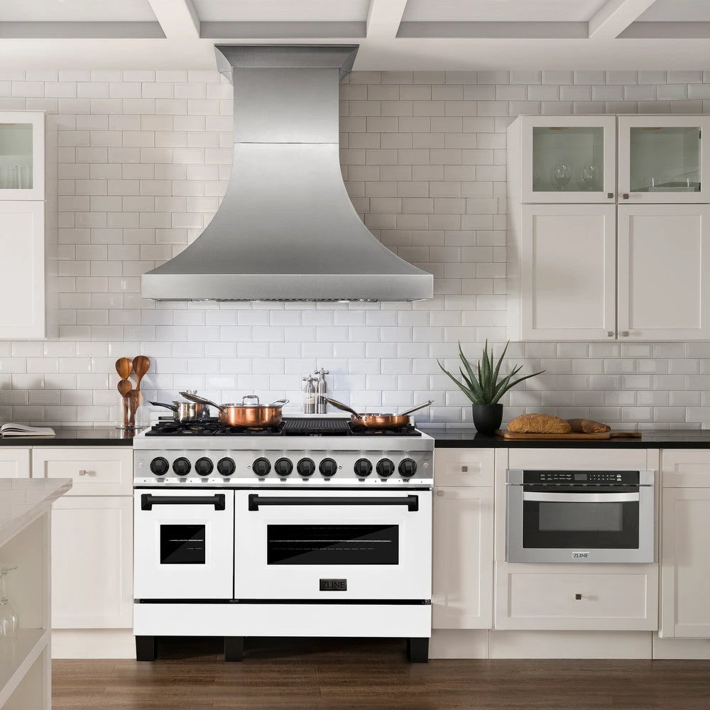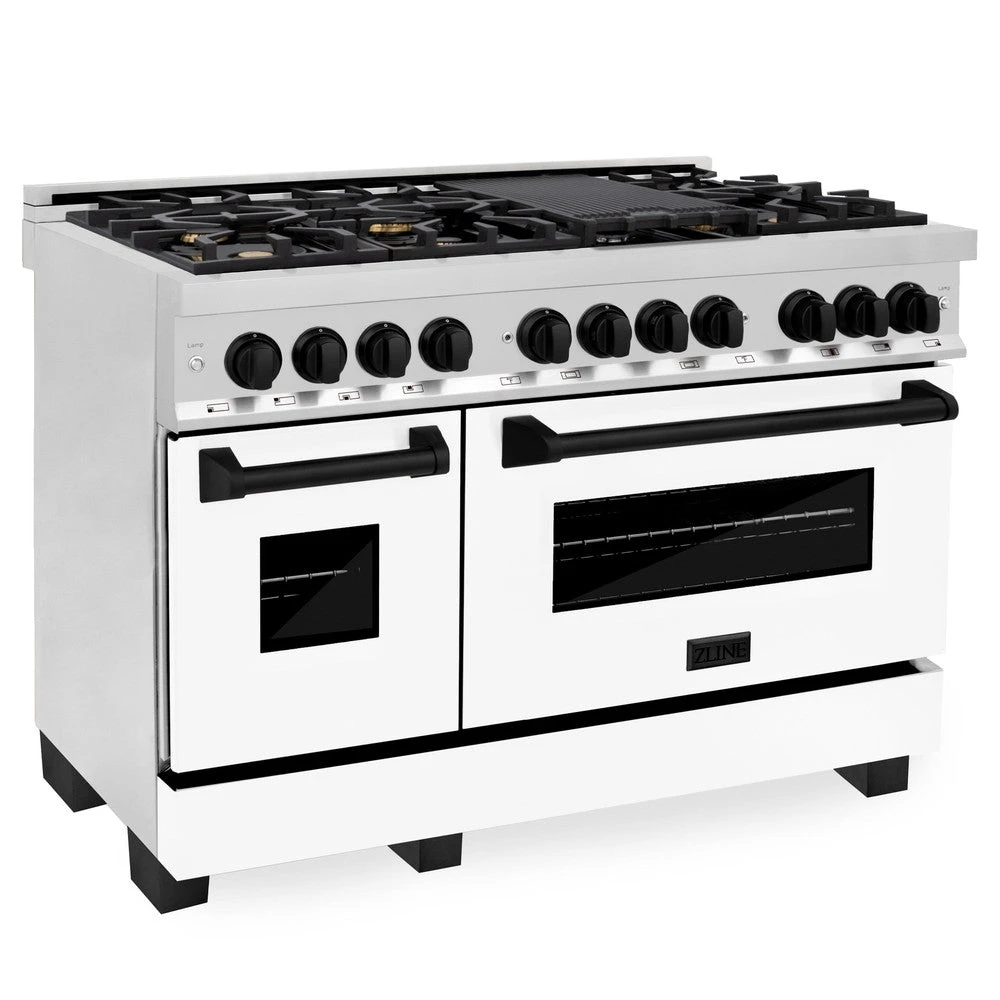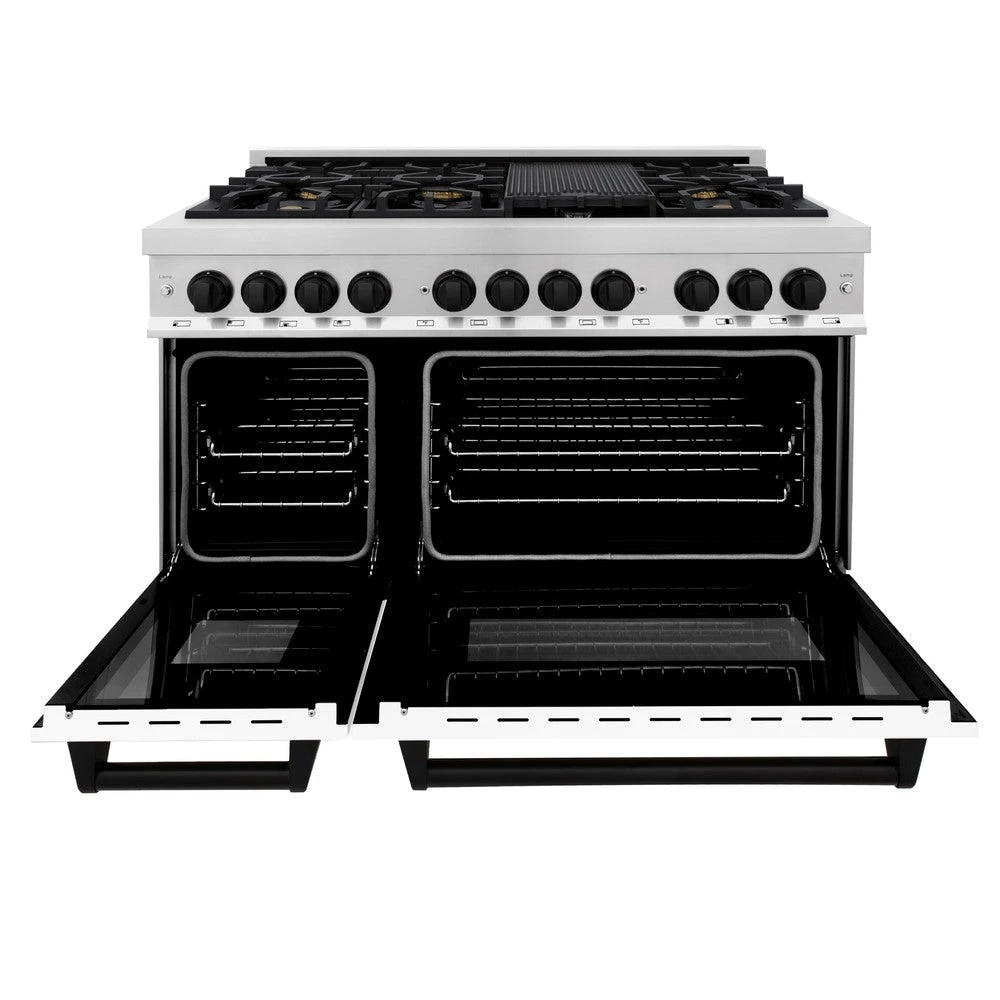 ZLINE Autograph Edition 48 In. 6.0 Cu. Ft. Legacy Dual Fuel Range With 7 Burner Gas Cooktop And 2 Electric Ovens In Stainless Steel With White Matte Doors And Matte Black Accents (RAZ-WM-48-MB)(Zline Autograph Edition 48 Legacy Dual Fuel Range Stainless Steel White Matte Matte Black Raz Wm 48 Mb)