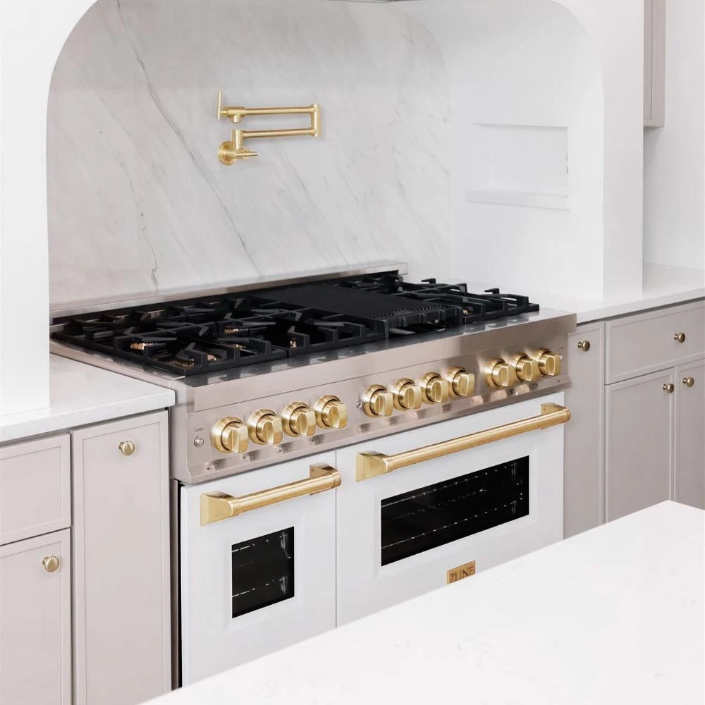 ZLINE Autograph Edition 48 In. 6.0 Cu. Ft. Legacy Dual Fuel Range With 7 Burner Gas Cooktop And 2 Electric Ovens In Stainless Steel With White Matte Doors And Polished Gold Accents (RAZ-WM-48-G)(Zline Autograph Edition 48 Legacy Dual Fuel Range Stainless Steel White Matte Gold Raz Wm 48 G)