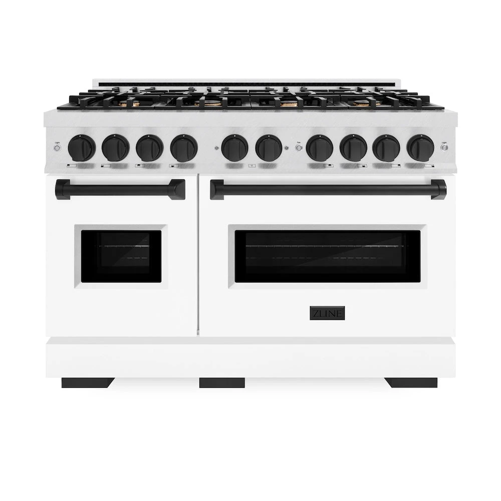 ZLINE Autograph Edition 48 In. 6.7 Cu. Ft. Classic Double Oven Dual Fuel Range With 8 Burner Gas Cooktop In Satin Stainless Steel With White Matte Doors And Matte Black Accents (CDRSZ-WM-48-MB)(Zline Autograph Edition 48 Classic Dual Fuel Range Satin Stainless Steel White Matte Matte Black Cdrsz Wm 48 Mb)