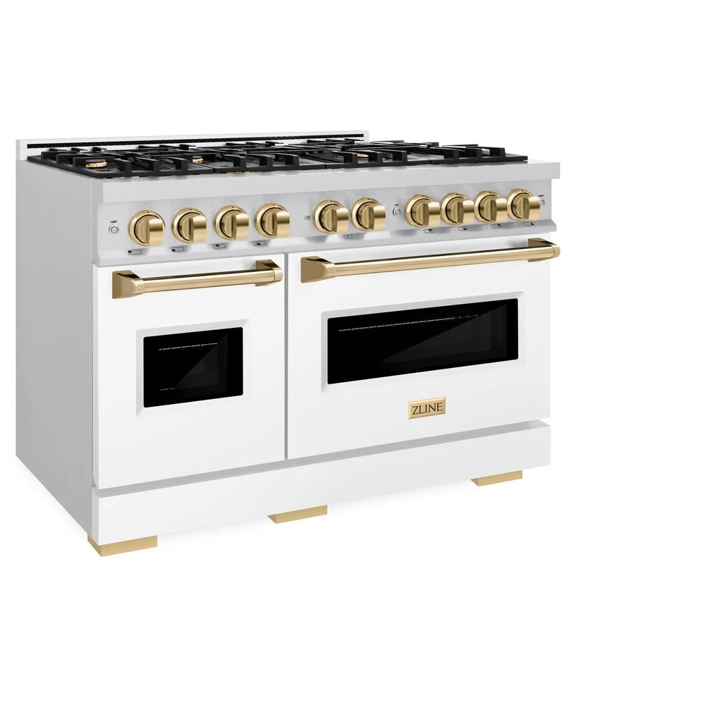 ZLINE Autograph Edition 48 In. 6.7 Cu. Ft. Classic Double Oven Gas Range With 8 Burner Cooktop In Stainless Steel With White Matte Doors And Polished Gold Accents (CGRZ-WM-48-G)(Zline Autograph Edition 48 Classic Gas Range Stainless Steel White Matte Polished Gold Cgrz Wm 48 G)