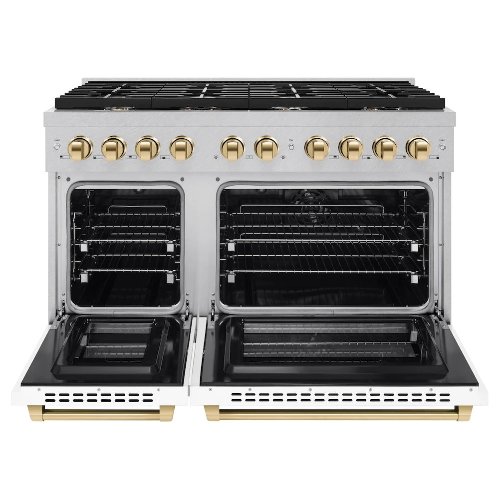 ZLINE Autograph Edition 48 In. 6.7 Cu. Ft. Paramount Double Oven Dual Fuel Range With 8 Burner Gas Cooktop In Satin Stainless Steel With White Matte Doors And Polished Gold Accents (SDRSZ-WM-48-G)(Zline Autograph Edition 48 Paramount Dual Fuel Range Satin Stainless Steel White Matte Polished Gold Sdrsz Wm 48 G)