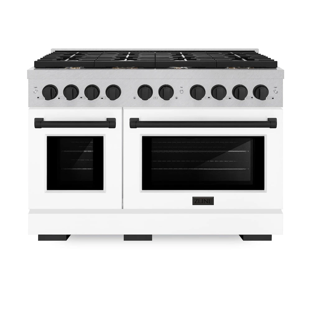 ZLINE Autograph Edition 48 In. 6.7 Cu. Ft. Paramount Double Oven Gas Range With 8 Burner Cooktop In Satin Stainless Steel With White Matte Doors And Matte Black Accents (SGRSZ-WM-48-MB)(Zline Autograph Edition 48 Paramount Gas Range Satin Stainless Steel White Matte Matte Black Sgrsz Wm 48 Mb)