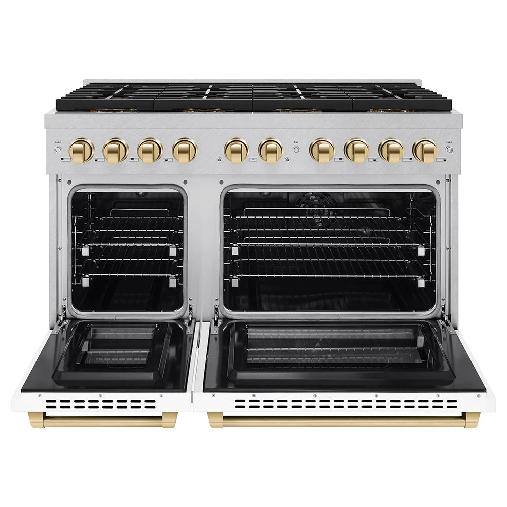 ZLINE Autograph Edition 48 In. 6.7 Cu. Ft. Paramount Dual Fuel Range With 8 Burner DuoPro™ Cooktop And Dual Ovens In Satin Stainless Steel With White Matte Doors And Polished Gold Accents (PSDRSZ-WM-48-G)(Zline Autograph Edition 48 Paramount Dual Fuel Range Duopro Satin Stainless Steel White Matte Polished Gold Psdrsz Wm 48 G)