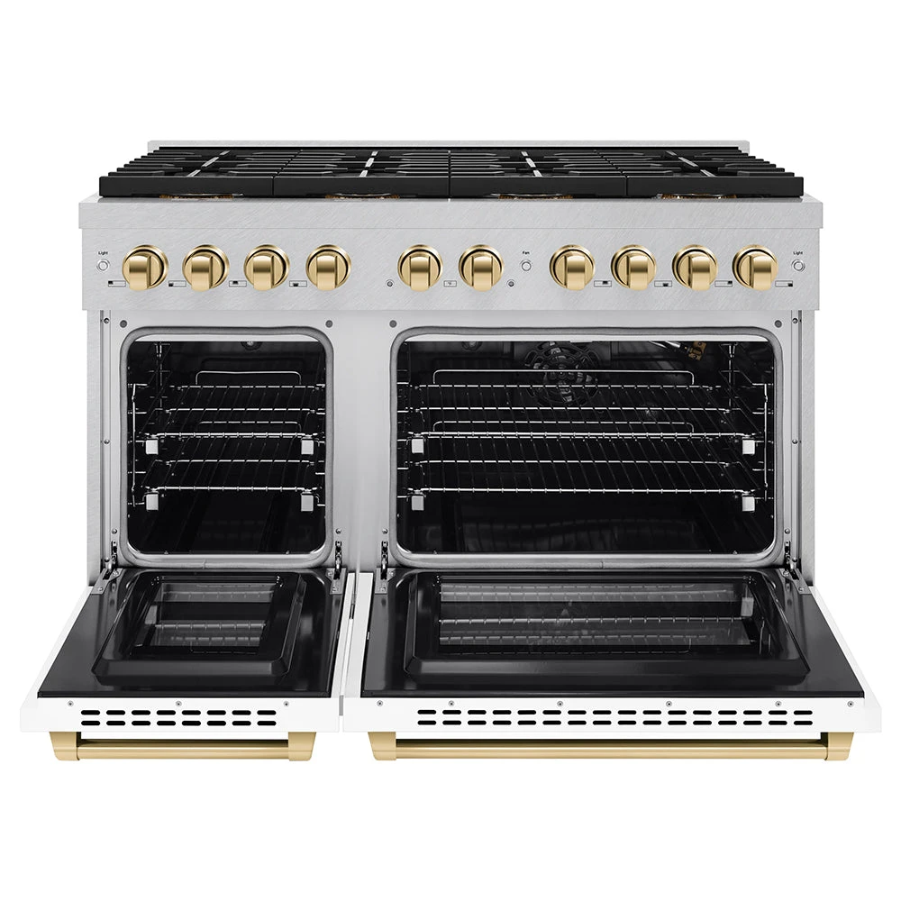 ZLINE Autograph Edition 48 In. 6.7 Cu. Ft. Paramount Gas Range With 8 Burner DuoPro™ Cooktop And Dual Ovens In Satin Stainless Steel With White Matte Doors And Polished Gold Accents (PSGRSZ-WM-48-G)(Zline Autograph Edition 48 Paramount Gas Range Duopro Satin Stainless Steel White Matte Polished Gold Psgrsz Wm 48 G)