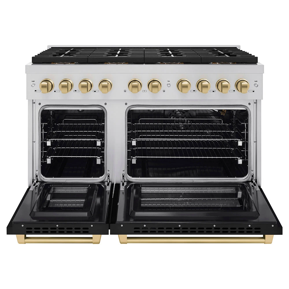 ZLINE Autograph Edition 48 In. 6.7 Cu. Ft. Paramount Gas Range With 8 Burner DuoPro™ Cooktop And Dual Ovens With Black Matte Doors And Champagne Bronze Accents (PSGRZ-BLM-48-CB)(Zline Autograph Edition 48 Paramount Gas Range Duopro Stainless Steel Black Matte Champagne Bronze Psgrz Blm 48 Cb)