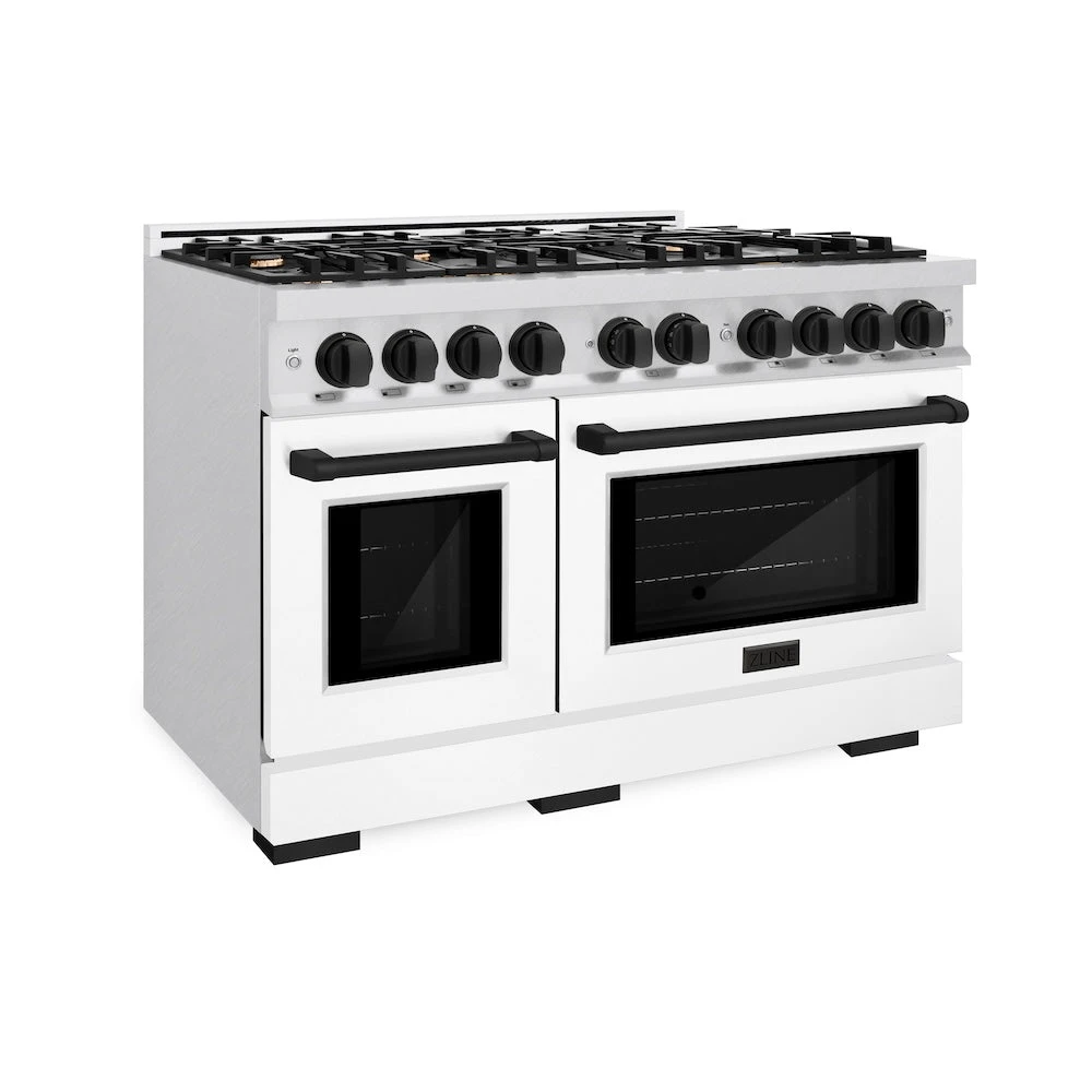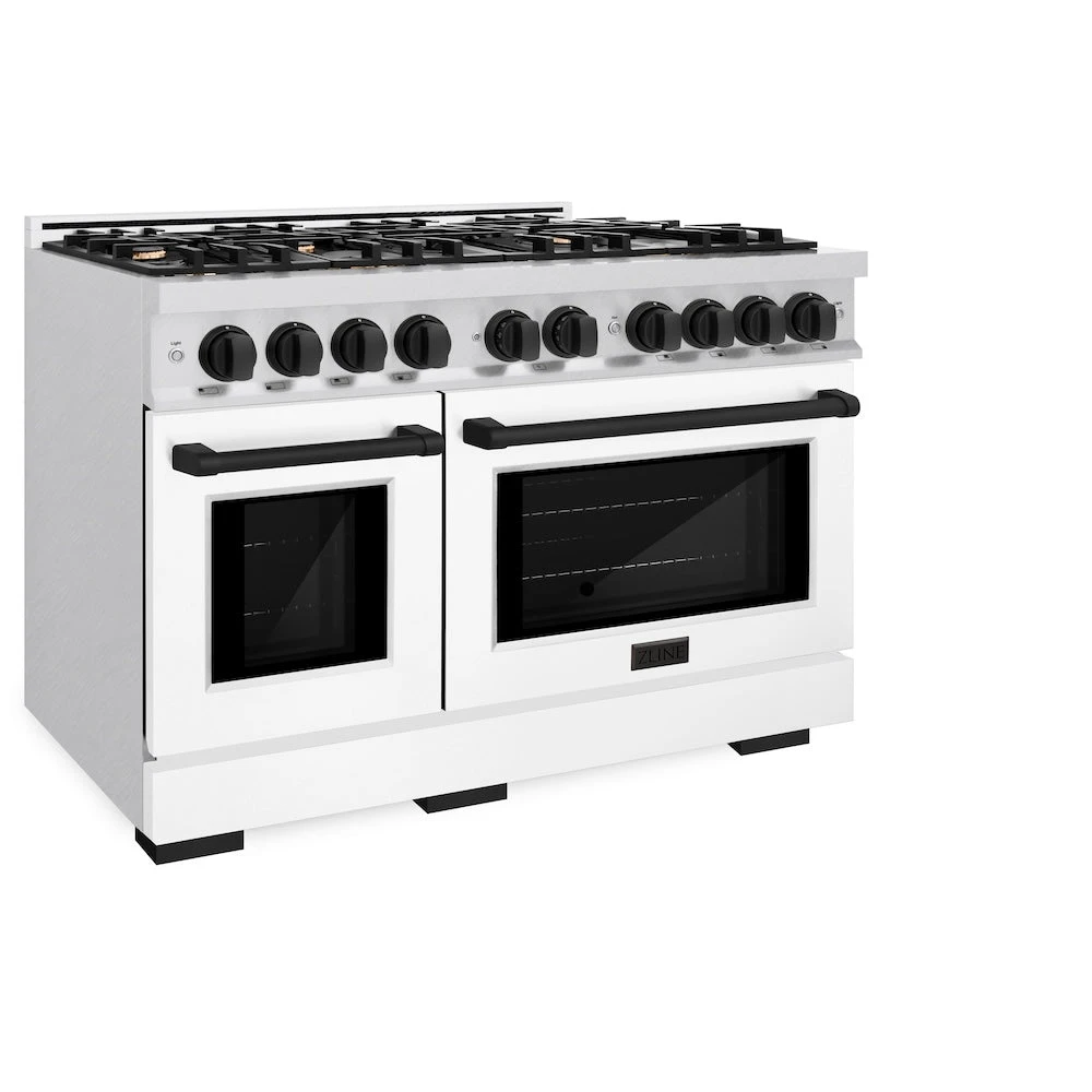 ZLINE Autograph Edition 48 In. 6.7 Cu. Ft. Select Double Oven Dual Fuel Range With 8 Burner Gas Cooktop In Satin Stainless Steel With White Matte Doors And Matte Black Accents (HDRSZ-WM-48-MB)(Zline Autograph Edition 48 Select Dual Fuel Range Satin Stainless Steel White Matte Matte Black Hdrsz Wm 48 Mb)