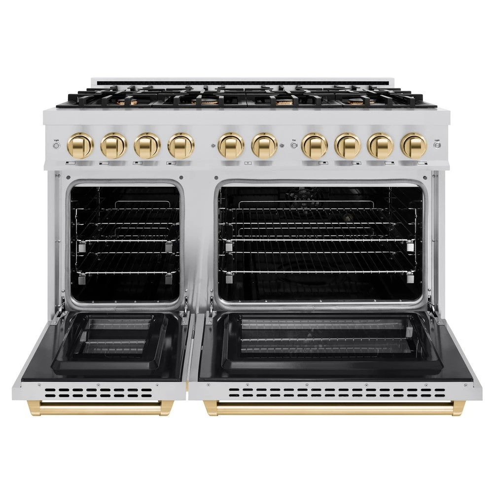 ZLINE Autograph Edition 48 In. 6.7 Cu. Ft. Select Double Oven Dual Fuel Range With 8 Burner Gas Cooktop In Stainless Steel And Polished Gold Accents (HDRZ-48-G)(Zline Autograph Edition 48 Select Dual Fuel Range Stainless Steel Polished Gold Hdrz 48 G)