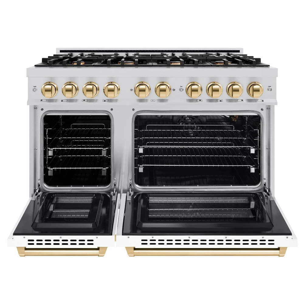 ZLINE Autograph Edition 48 In. 6.7 Cu. Ft. Select Double Oven Gas Range With 8 Burner Cooktop In Stainless Steel With White Matte Doors And Polished Gold Accents (HGRZ-WM-48-G)(Zline Autograph Edition 48 Select Gas Range Stainless Steel White Matte Polished Gold Hgrz Wm 48 G)