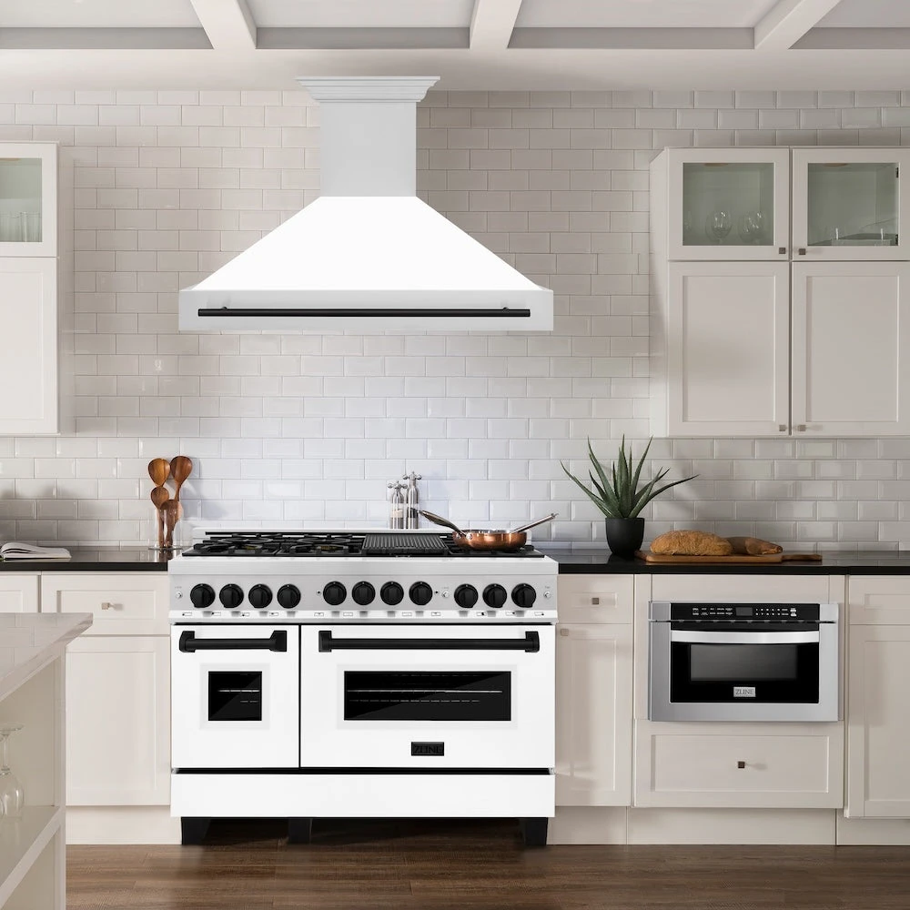 ZLINE Autograph Edition 48 In. Stainless Steel Range Hood With White Matte Shell And Matte Black Handle (8654STZ-WM48-MB)(Zline Autograph Edition 48 Wall Mount Range Hood Stainless Steel White Matte Matte Black 8654stz Wm48 Mb)