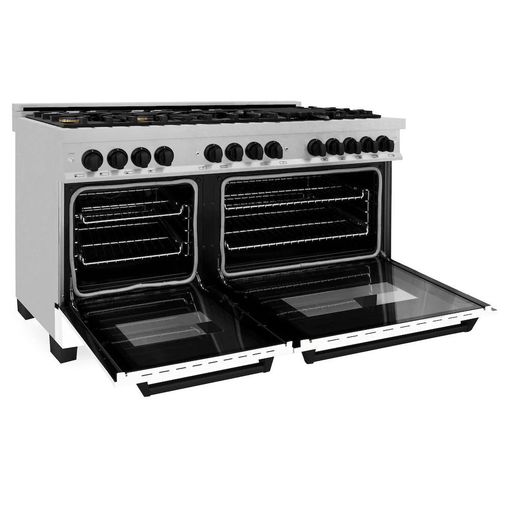 ZLINE Autograph Edition 60 In. 7.4 Cu. Ft. Legacy Dual Fuel Range With 9 Burner Gas Cooktop And 2 Electric Convection Ovens In Satin Stainless Steel With White Matte Doors And Matte Black Accents (RASZ-WM-60-MB)(Zline Autograph Edition 60 Legacy Dual Fuel Range Satin Stainless Steel White Matte Matte Black Rasz Wm 60 Mb)